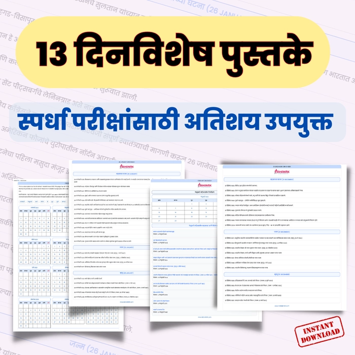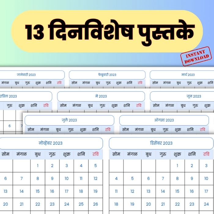 आम्ही तुम्हाला १२ प्रत्येक महिन्यांचे दिनविशेष पुस्तके तसेच एक संपूर्ण वर्षाचे दिनविशेष पुस्तक उपलब्ध करून देत आहोत.